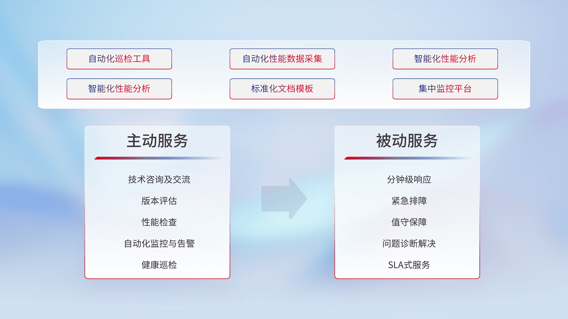 智能化工具和标准化文档,,,保障服务质量,,提供主动服务(包含技术咨询、、、、版本评估、、性能检查、、、、自动化监控与告警、、健康巡检)和被动服务包含(分钟级响应、、、、紧急排障、、、值守保障、、、问题诊断解决、、SLA服务)。。。
